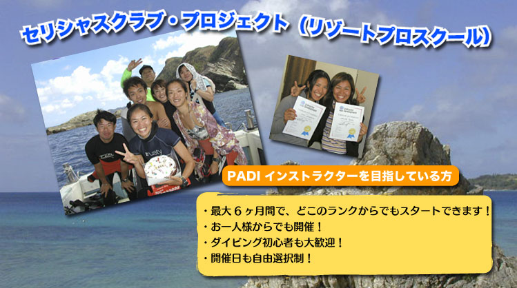 PADIインストラクターを目指されている方で足元を固め、しっかりとした積み重ねをお考えの方はセリシャスクラブプロジェクト・リゾートプロコースをご受講下さい。最大6ヶ月間(ご希望により延長可能)どこのランクからでもスタート可能です。もちろん、お一人様から開催させて頂きますし、これからダイビングを始められる方も大歓迎です。開始日もご都合の良い日から開始可能です。
